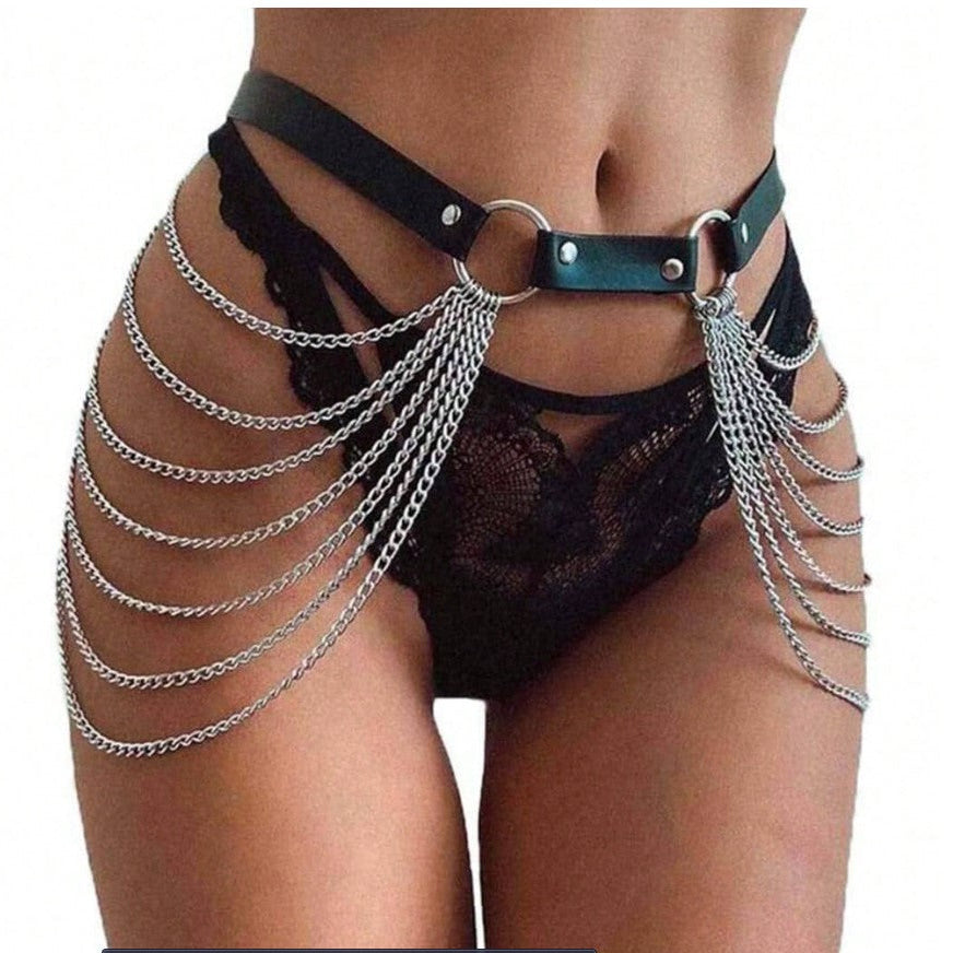 Turn up the heat with the BoldGleam Leather Body Chain. Sleek, adjustable, and crafted from premium leather, this belly and thigh strap adds a fierce edge to your lingerie or gothic look. Perfect for bold, confident style that won’t go unnoticed.