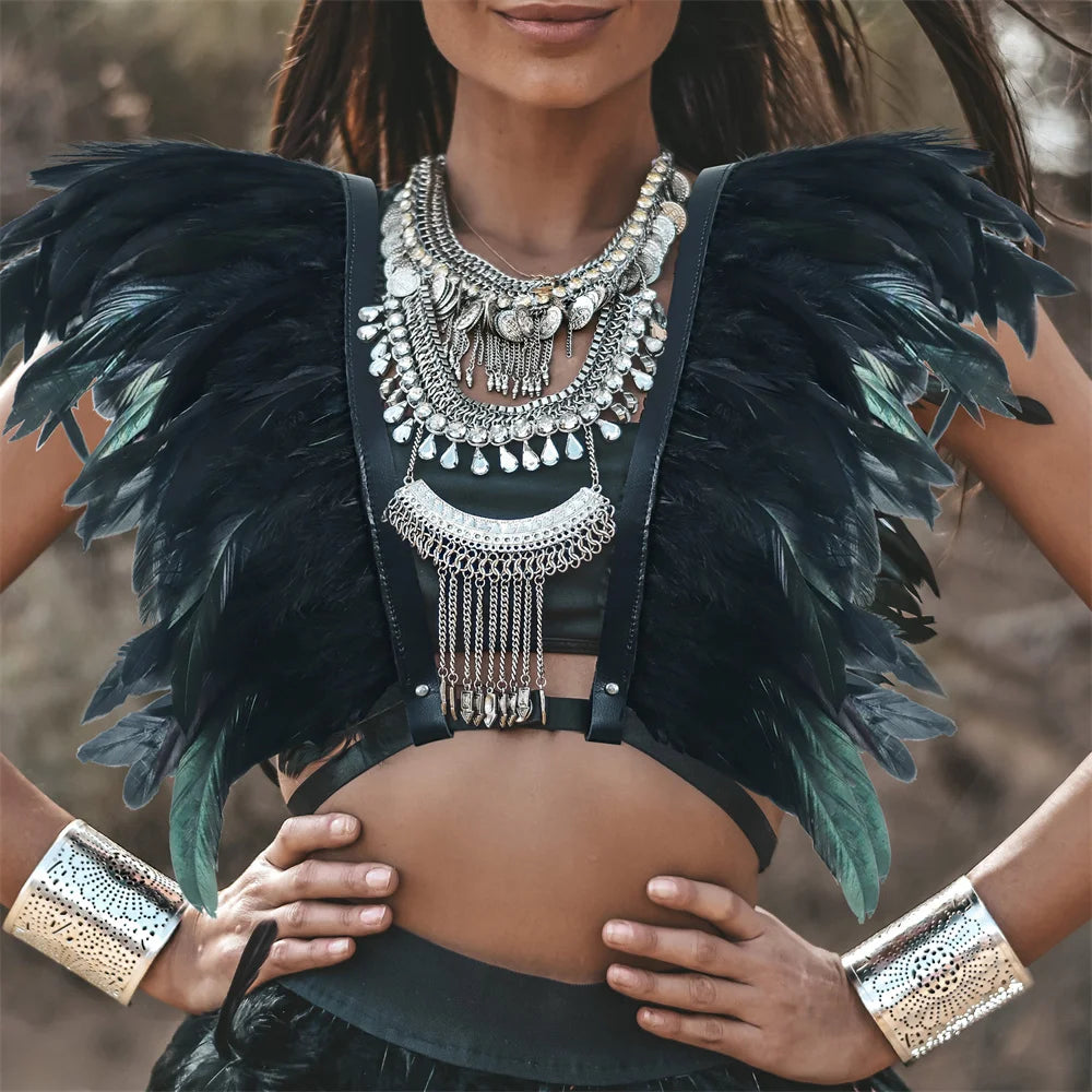Command every gaze with the DarkWing Bolero, a breathtaking fusion of dark fantasy and dramatic elegance. Draped in soft, layered feathers that shimmer with midnight allure, this shoulder wrap transforms any look into a statement of mystery and power.