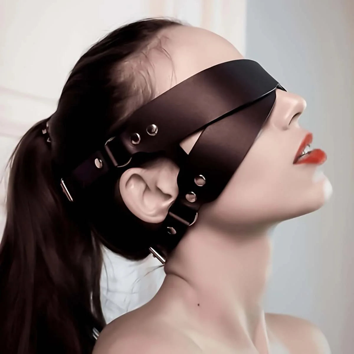 Step into the night with Eclipsera Eye Mask, where mystery meets seduction. Crafted from premium artificial leather and adorned with riveted accents, this statement piece radiates confidence, allure, and dominance.